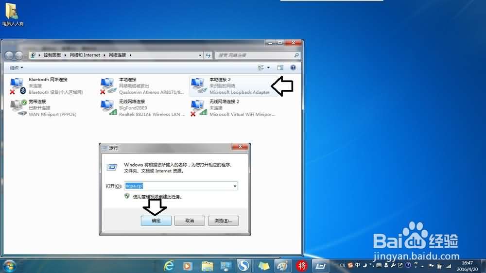 11、再在运行中输入:ncpa.cpl →确定(或按回车键)打开网络连接→Microsoft Loopback Adapter连接已经生成。