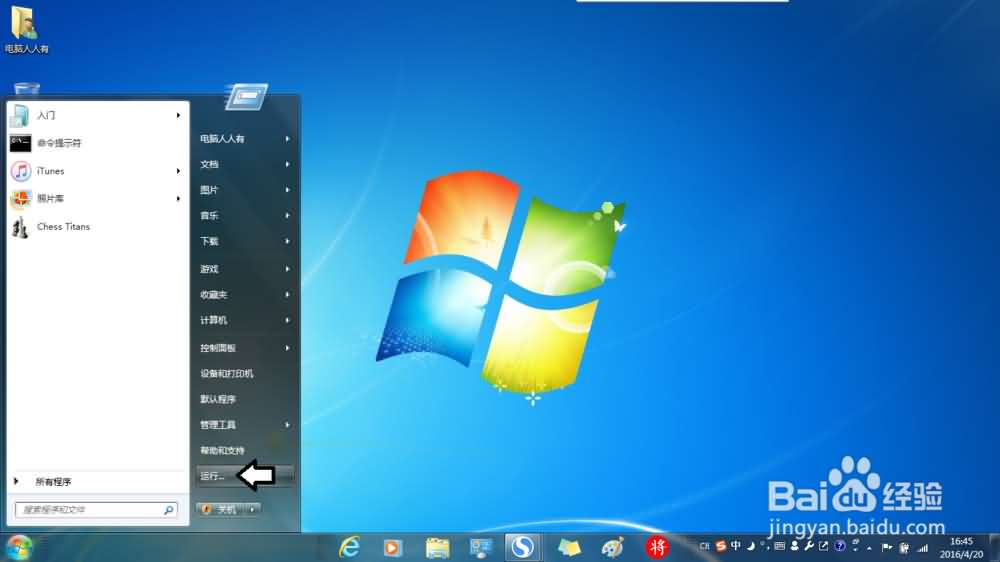 1、开始→运行(如果菜单中没有可以在开始属性中设置),也可以使用Windows+R组合键调出运行。