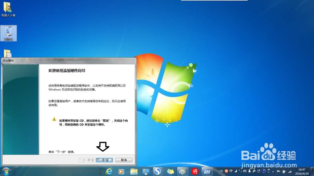 3、添加硬件向导(这里提示了如有硬件的光盘,可以使用光盘安装,但该功能为系统自带无需光盘)→下一步。