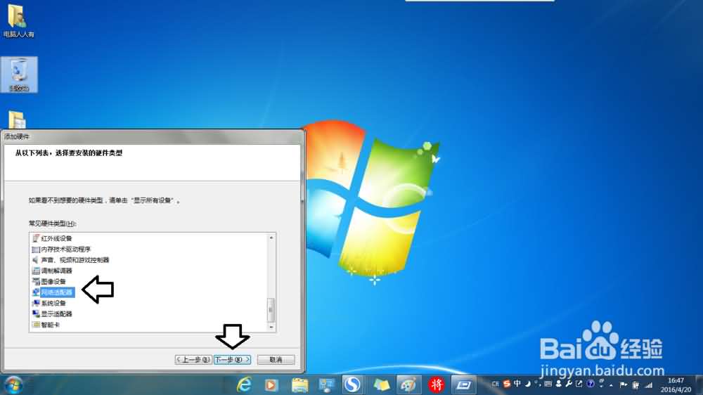5、往下找点选网络适配器→下一步。